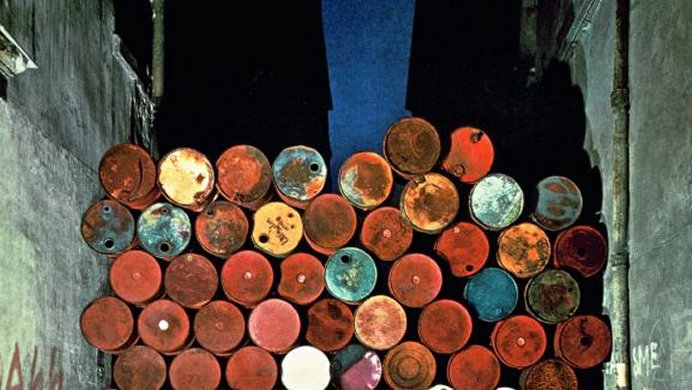 【快闪装置艺术】:1962年6月27日傍晚,克里斯托用大卡车将近 50个空油桶卸在维斯孔蒂街,摞起制成“铁墙”,街道无法通行8小时。他被带到警察局,后被放没被起诉