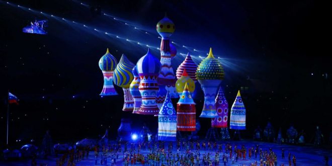 После зрители на стадионе увидели театрализованное представление, продемонстрировавшее основные вехи русской истории – от Древней Руси и времен Петра I и до Советского Союза.